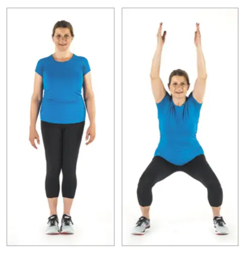 - Step out to the right, bending your knees and hips, and lowering into a squat as you sweep your arms out to the sides and up overhead. Keep your knees no farther forward than your toes as you squat. Don’t let your shoulders come up toward your ears as you raise your arms.