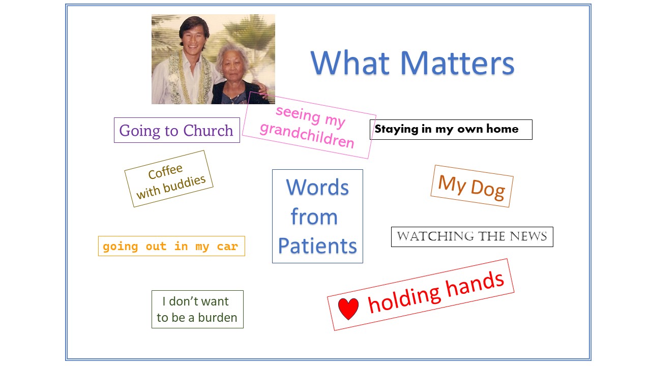 Most of us, if we live long enough, will have a period of frailty. Some of us will be diagnosed with Alzheimer’s Diseases. What will doing good mean for each of us under those circumstances? Good care for a frail older adult starts with assistance in basic and physical needs. Safety must be assured. But these “tasks” are insufficient if we have unmet emotional and spiritual needs. Each one of us will want support that is guided by what matters most to each of us. Finding out what does matter is a gift of love and respect. What matters to you is a very different question from “What’s the matter?” It tells a senior that who she/he is IS important. Whatever the person likes or dislikes, thinks, feels, experiences, enjoys, matters. Some people have rarely been given that gift their entire lives. A caregiver adds joy to life by making things that matter a priority. In turn, caregiving is enriched.
