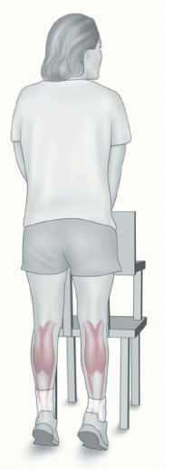 Stand with your feet flat on the floor. Hold onto the back of your chair for balance. Raise yourself up on tiptoe, as high as possible. Hold briefly, then lower yourself. Aim for 8–12 repetitions. Rest and repeat the set.