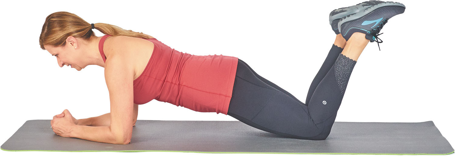 Bridge Lie on your back with your knees bent and feet flat on the floor, hip-width apart. Place your arms at your sides. Tighten your buttocks, then lift your hips up off the floor until they form a straight line with your hips and shoulders. Hold. Return to the starting position. Repeat 10 times. Opposite arm and leg raise Kneel on all fours, with your head and spine neutral. Extend your left leg off the floor behind you while reaching out in front of you with your right arm. Keeping your hips and shoulders squared, try to bring that leg and arm parallel to the floor. Hold, then return to the starting position. Repeat the exercise with your right leg and left arm. Repeat the exercise on both sides 10 times. Modified plank Start on your hands and knees. Tighten your abdominal muscles and lower your upper body onto your forearms, aligning your shoulders directly over your elbows and keeping your feet in the air behind you. Keep your back straight, making your body as much like a “plank” as possible. Hold the position and return to the starting position. Repeat 10 times. Exercise photos by Thomas MacDonald |